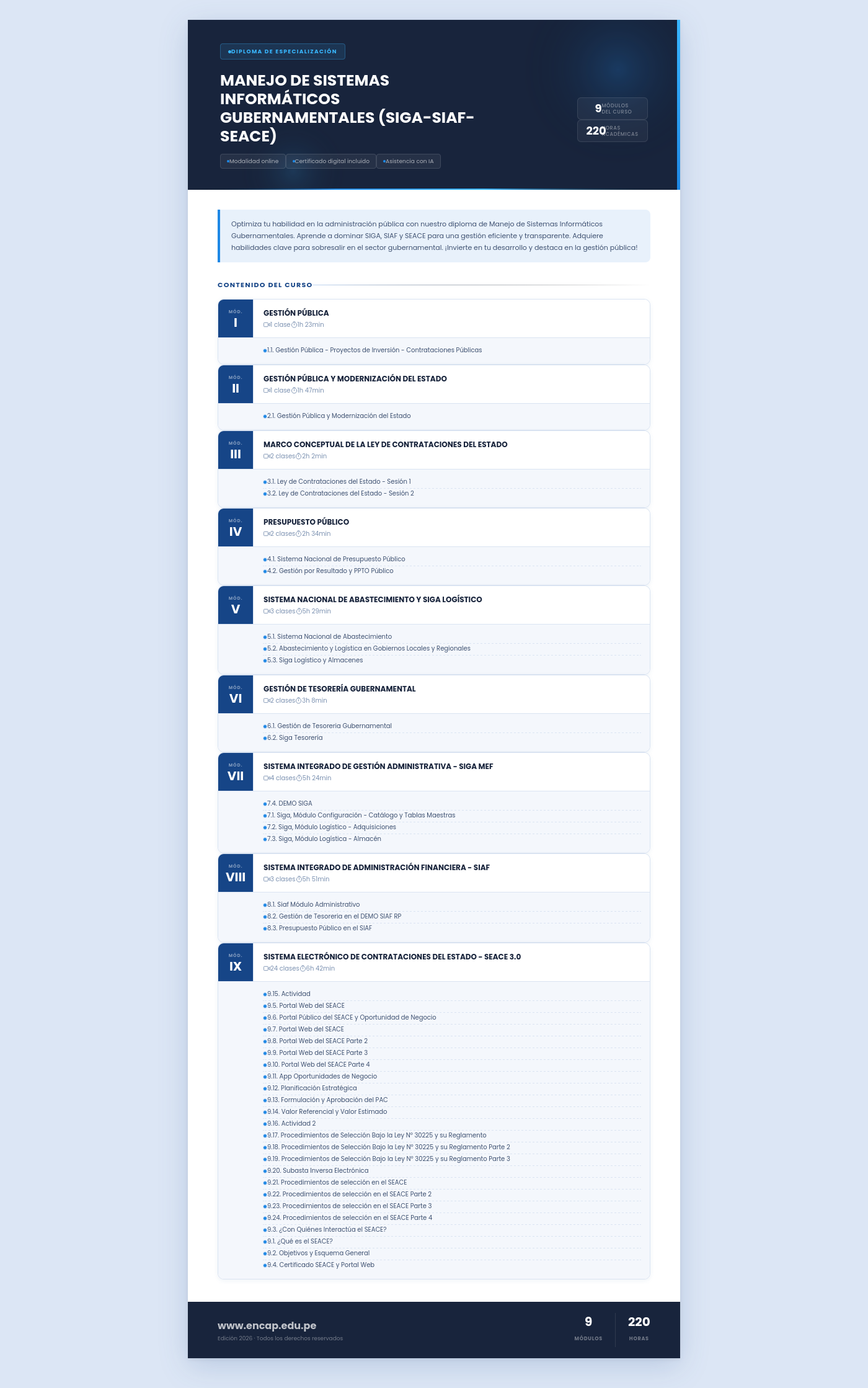 Optimiza tu habilidad en la administración pública con nuestro diploma de Manejo de Sistemas Informáticos Gubernamentales. Aprende a dominar SIGA, SIAF y SEACE para una gestión eficiente y transparente. Adquiere habilidades clave para sobresalir en el sector gubernamental. ¡Invierte en tu desarrollo y destaca en la gestión pública!