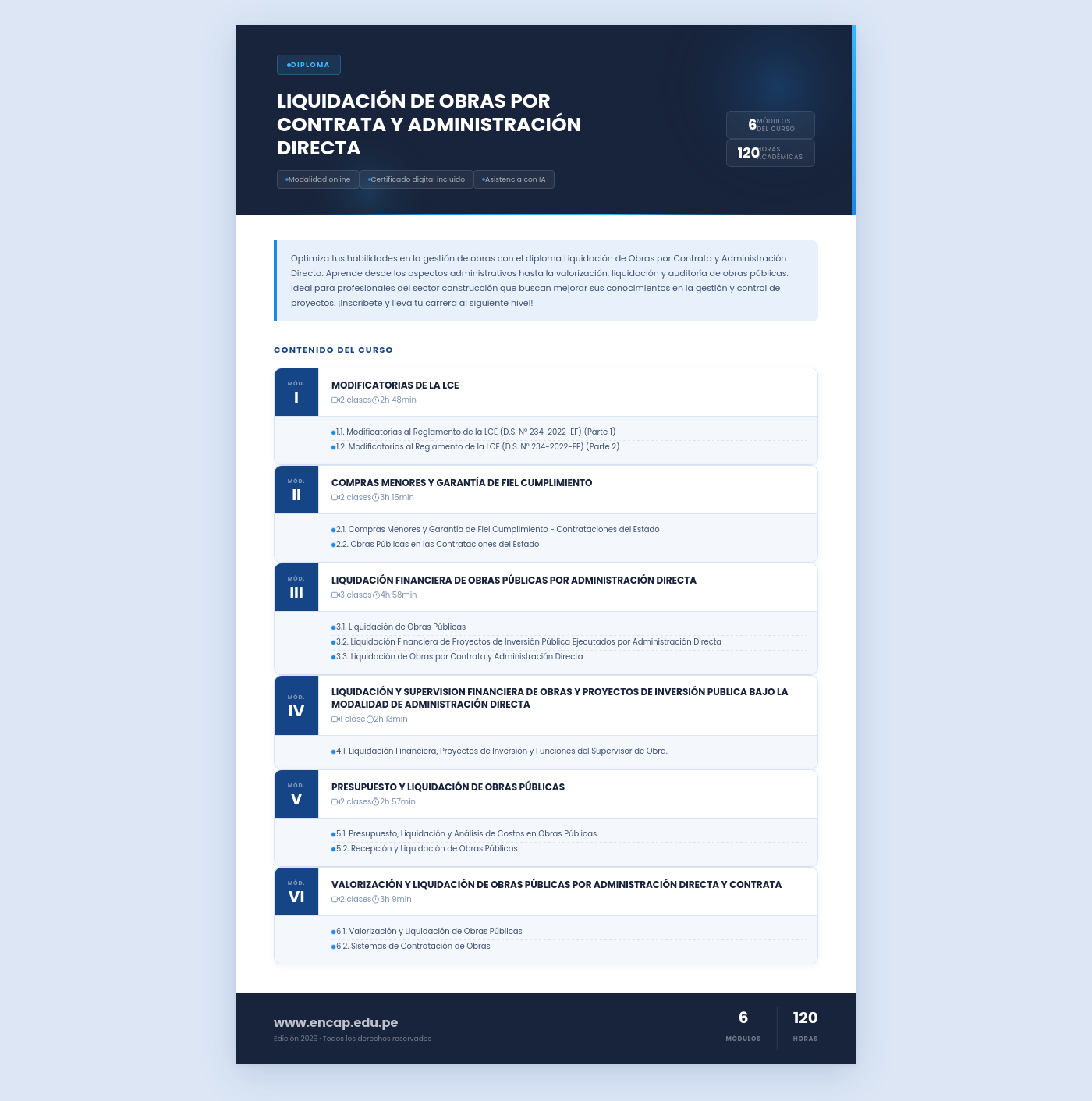 Optimiza tus habilidades en la gestión de obras con el diploma Liquidación de Obras por Contrata y Administración Directa. Aprende desde los aspectos administrativos hasta la valorización, liquidación y auditoría de obras públicas. Ideal para profesionales del sector construcción que buscan mejorar sus conocimientos en la gestión y control de proyectos. ¡Inscríbete y lleva tu carrera al siguiente nivel!