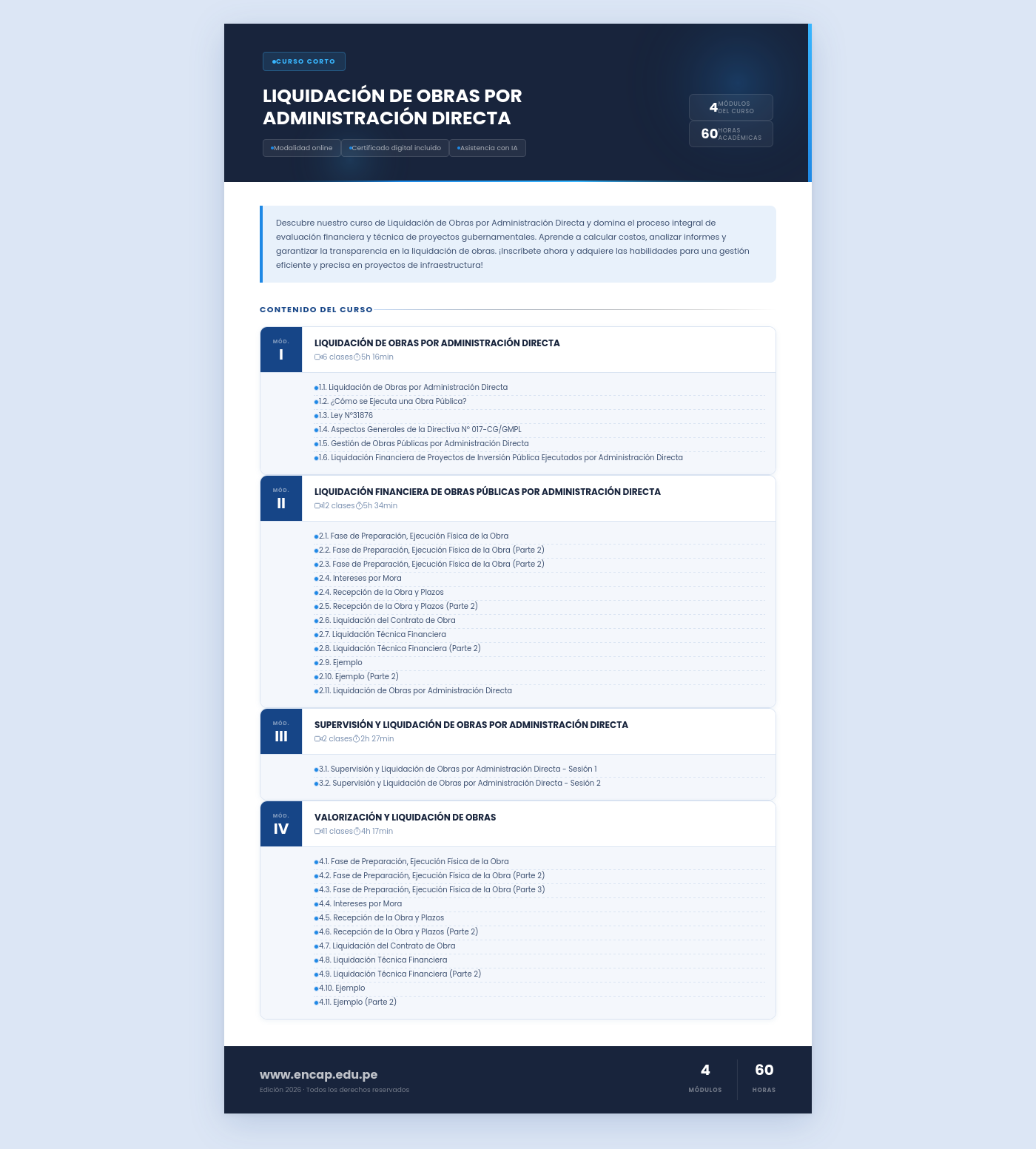 Descubre nuestro curso de Liquidación de Obras por Administración Directa y domina el proceso integral de evaluación financiera y técnica de proyectos gubernamentales. Aprende a calcular costos, analizar informes y garantizar la transparencia en la liquidación de obras. ¡Inscríbete ahora y adquiere las habilidades para una gestión eficiente y precisa en proyectos de infraestructura!