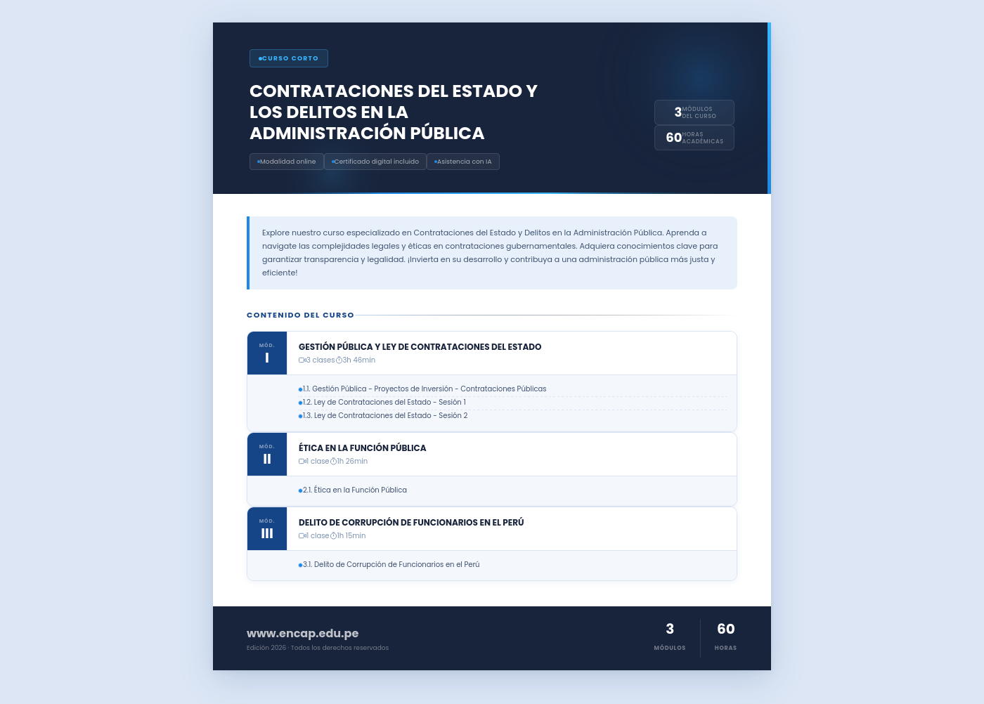 Explore nuestro curso especializado en Contrataciones del Estado y Delitos en la Administración Pública. Aprenda a navigate las complejidades legales y éticas en contrataciones gubernamentales. Adquiera conocimientos clave para garantizar transparencia y legalidad. ¡Invierta en su desarrollo y contribuya a una administración pública más justa y eficiente!