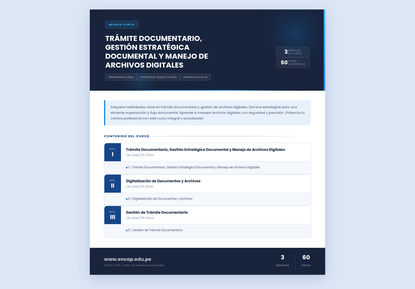 Adquiere habilidades clave en trámite documentario y gestión de archivos digitales. Domina estrategias para una eficiente organización y flujo documental. Aprende a manejar archivos digitales con seguridad y precisión. ¡Potencia tu carrera profesional con este curso integral y actualizado!