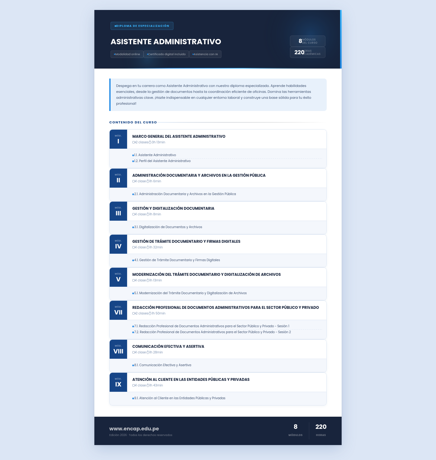 Despega en tu carrera como Asistente Administrativo con nuestro diploma especializado. Aprende habilidades esenciales, desde la gestión de documentos hasta la coordinación eficiente de oficinas. Domina las herramientas administrativas clave. ¡Hazte indispensable en cualquier entorno laboral y construye una base sólida para tu éxito profesional!