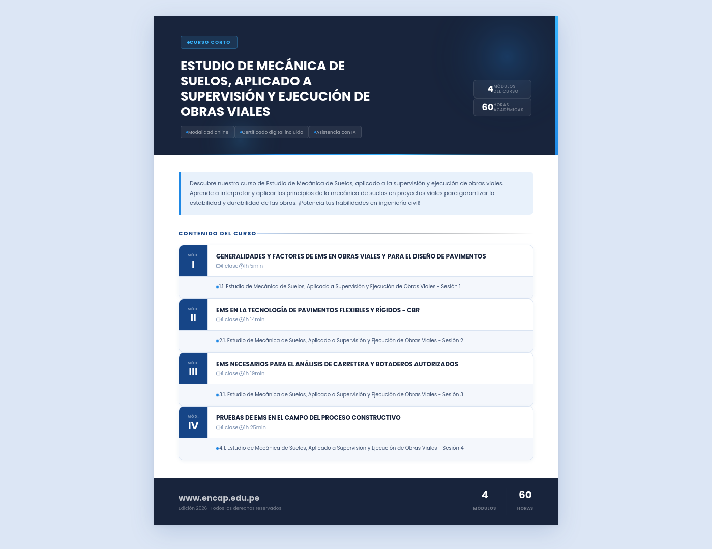 Descubre nuestro curso de Estudio de Mecánica de Suelos, aplicado a la supervisión y ejecución de obras viales. Aprende a interpretar y aplicar los principios de la mecánica de suelos en proyectos viales para garantizar la estabilidad y durabilidad de las obras. ¡Potencia tus habilidades en ingeniería civil!