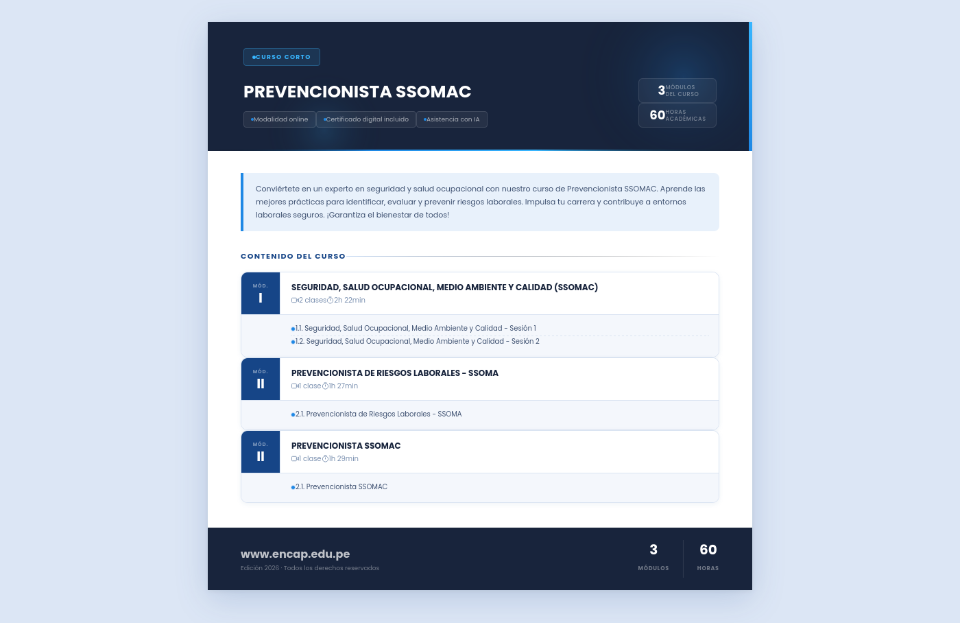 Conviértete en un experto en seguridad y salud ocupacional con nuestro curso de Prevencionista SSOMAC. Aprende las mejores prácticas para identificar, evaluar y prevenir riesgos laborales. Impulsa tu carrera y contribuye a entornos laborales seguros. ¡Garantiza el bienestar de todos!