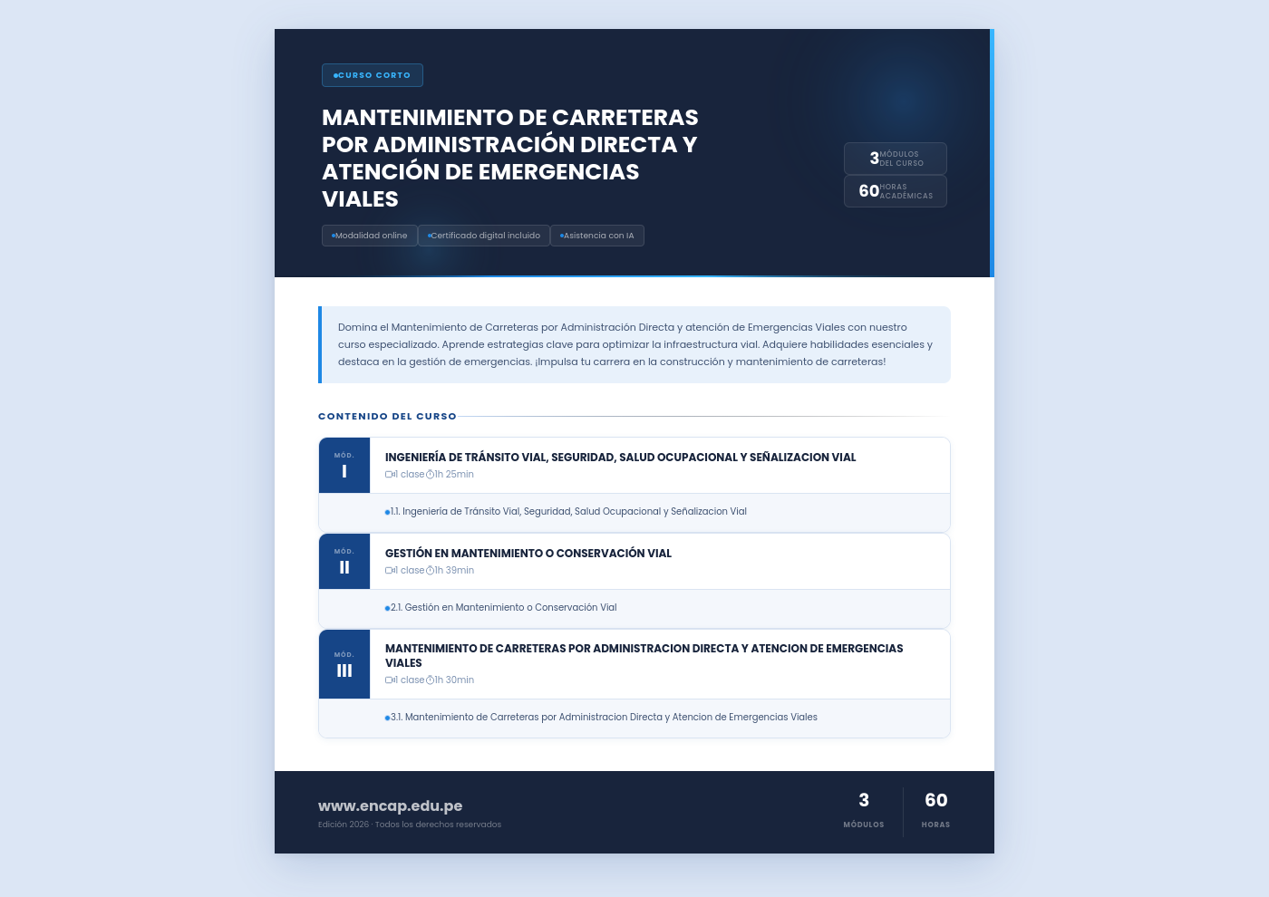 Domina el Mantenimiento de Carreteras por Administración Directa y atención de Emergencias Viales con nuestro curso especializado. Aprende estrategias clave para optimizar la infraestructura vial. Adquiere habilidades esenciales y destaca en la gestión de emergencias. ¡Impulsa tu carrera en la construcción y mantenimiento de carreteras!