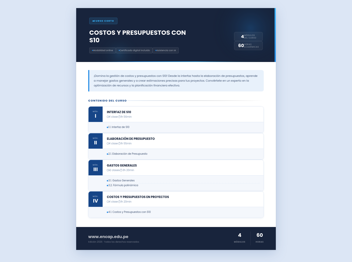 ¡Domina la gestión de costos y presupuestos con S10! Desde la interfaz hasta la elaboración de presupuestos, aprende a manejar gastos generales y a crear estimaciones precisas para tus proyectos. Conviértete en un experto en la optimización de recursos y la planificación financiera efectiva.