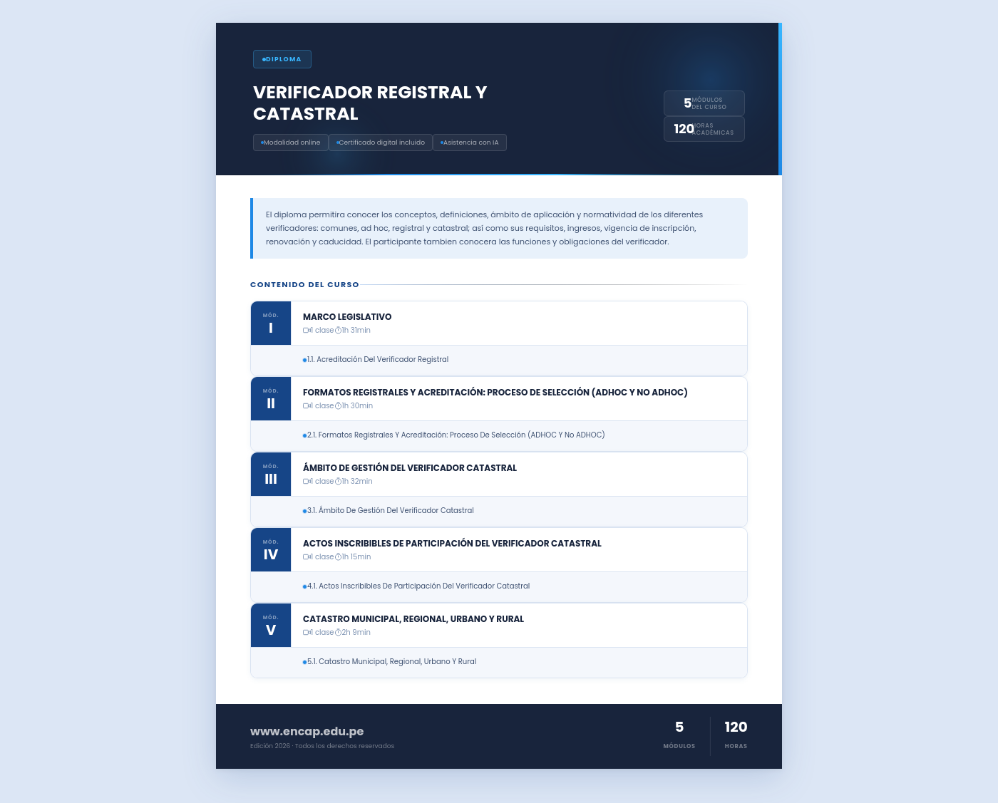 El diploma permitira conocer los conceptos, definiciones, ámbito de aplicación y normatividad de los diferentes verificadores: comunes, ad hoc, registral y catastral; así como sus requisitos, ingresos, vigencia de inscripción, renovación y caducidad. El participante tambien conocera las funciones y obligaciones del verificador.