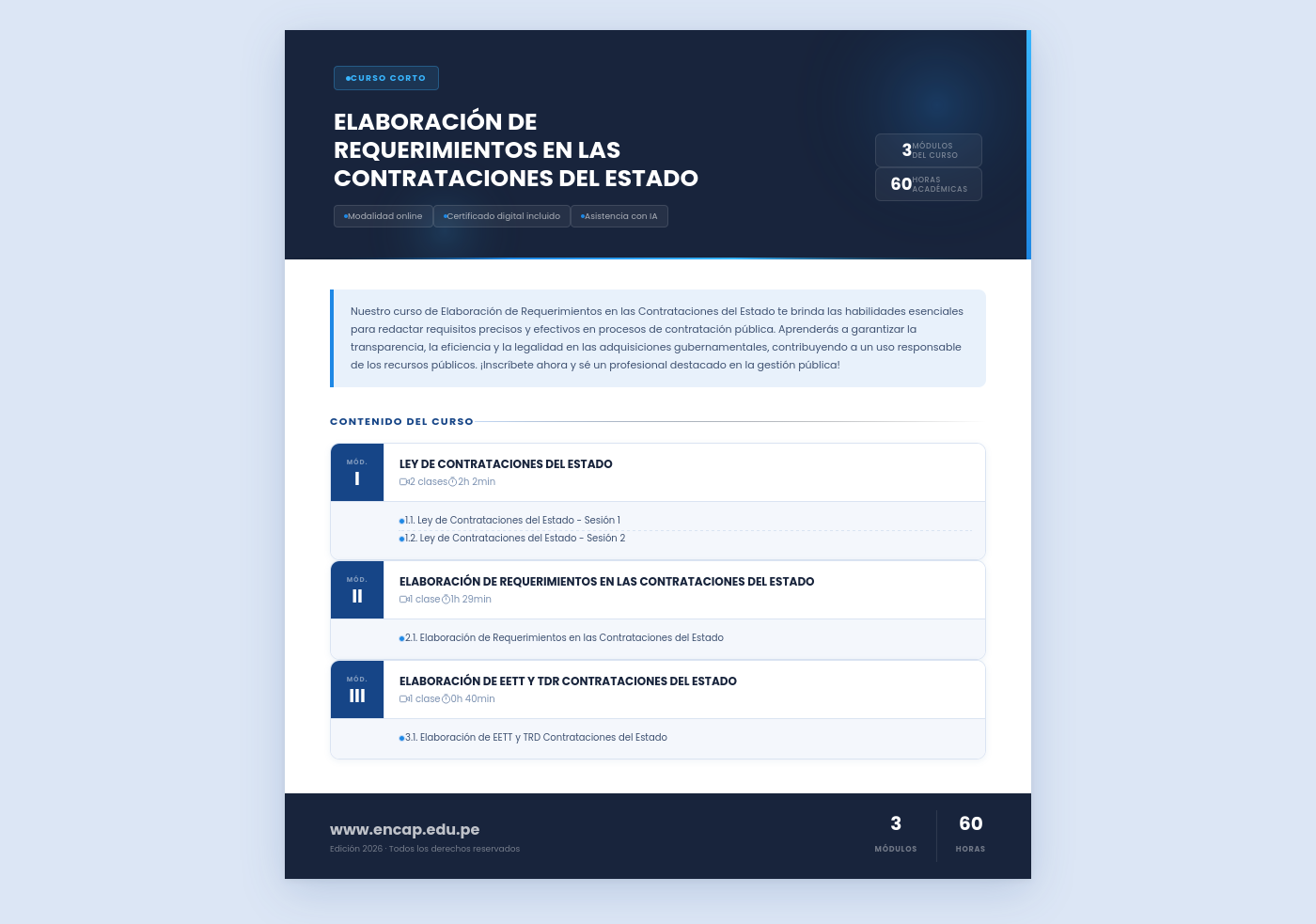 Nuestro curso de Elaboración de Requerimientos en las Contrataciones del Estado te brinda las habilidades esenciales para redactar requisitos precisos y efectivos en procesos de contratación pública. Aprenderás a garantizar la transparencia, la eficiencia y la legalidad en las adquisiciones gubernamentales, contribuyendo a un uso responsable de los recursos públicos. ¡Inscríbete ahora y sé un profesional destacado en la gestión pública!