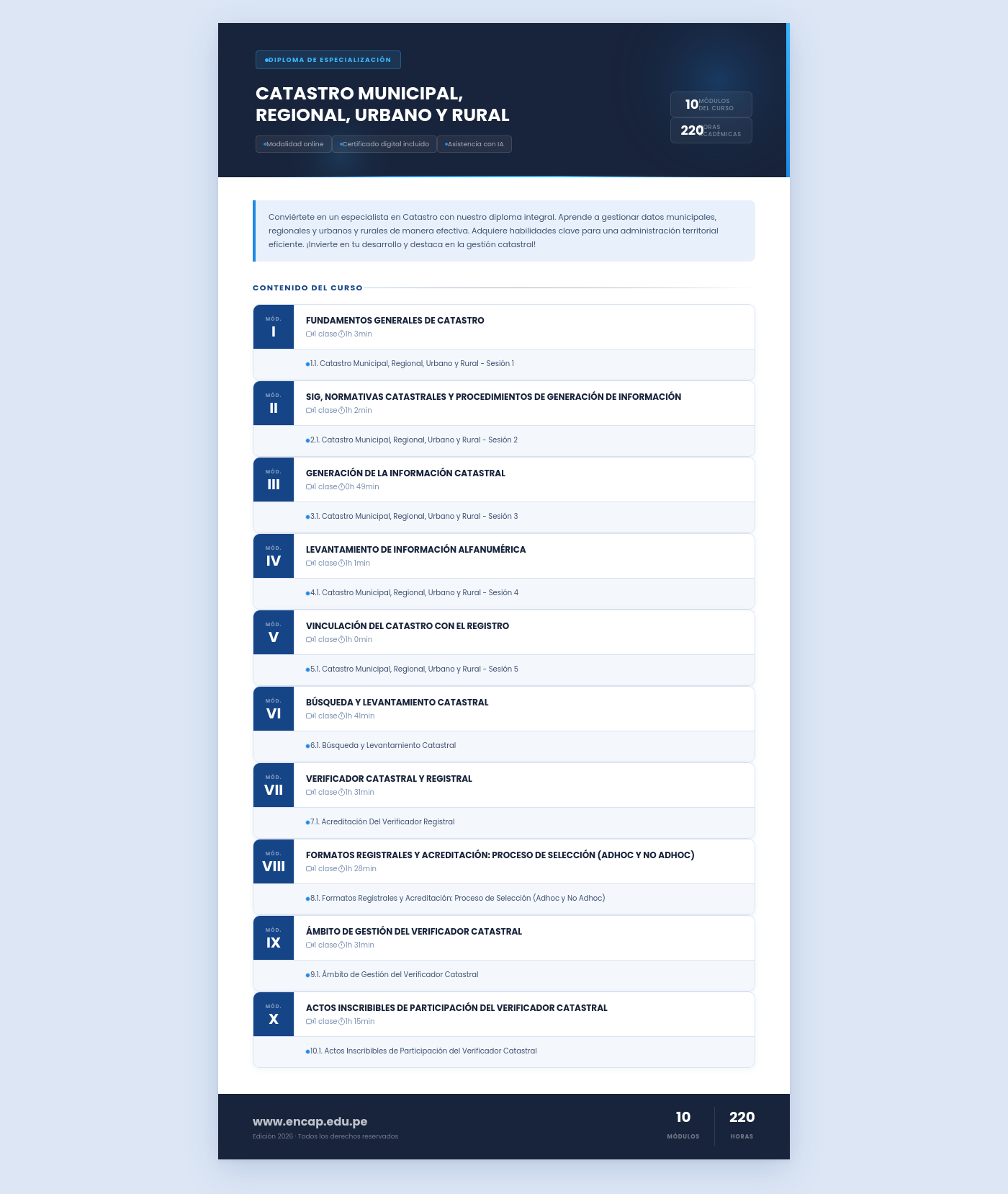 Conviértete en un especialista en Catastro con nuestro diploma integral. Aprende a gestionar datos municipales, regionales y urbanos y rurales de manera efectiva. Adquiere habilidades clave para una administración territorial eficiente. ¡Invierte en tu desarrollo y destaca en la gestión catastral!