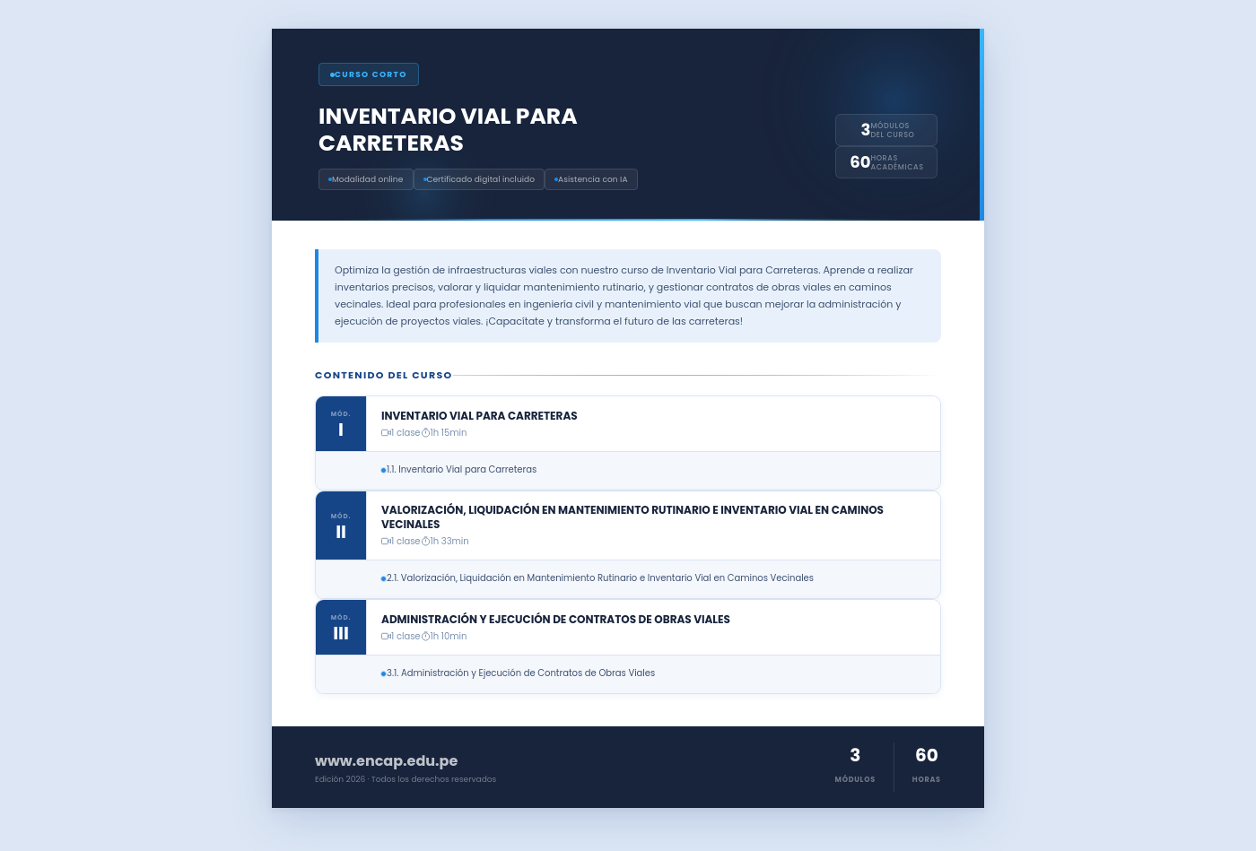 Optimiza la gestión de infraestructuras viales con nuestro curso de Inventario Vial para Carreteras. Aprende a realizar inventarios precisos, valorar y liquidar mantenimiento rutinario, y gestionar contratos de obras viales en caminos vecinales. Ideal para profesionales en ingeniería civil y mantenimiento vial que buscan mejorar la administración y ejecución de proyectos viales. ¡Capacítate y transforma el futuro de las carreteras!