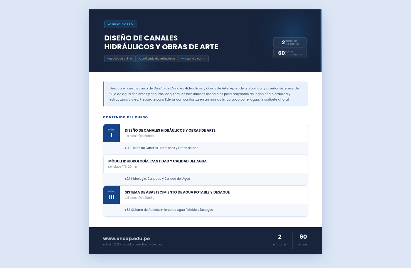 Descubre nuestro curso de Diseño de Canales Hidráulicos y Obras de Arte. Aprende a planificar y diseñar sistemas de flujo de agua eficientes y seguros. Adquiere las habilidades esenciales para proyectos de ingeniería hidráulica y estructuras viales. Prepárate para liderar con confianza en un mundo impulsado por el agua. ¡Inscríbete ahora!