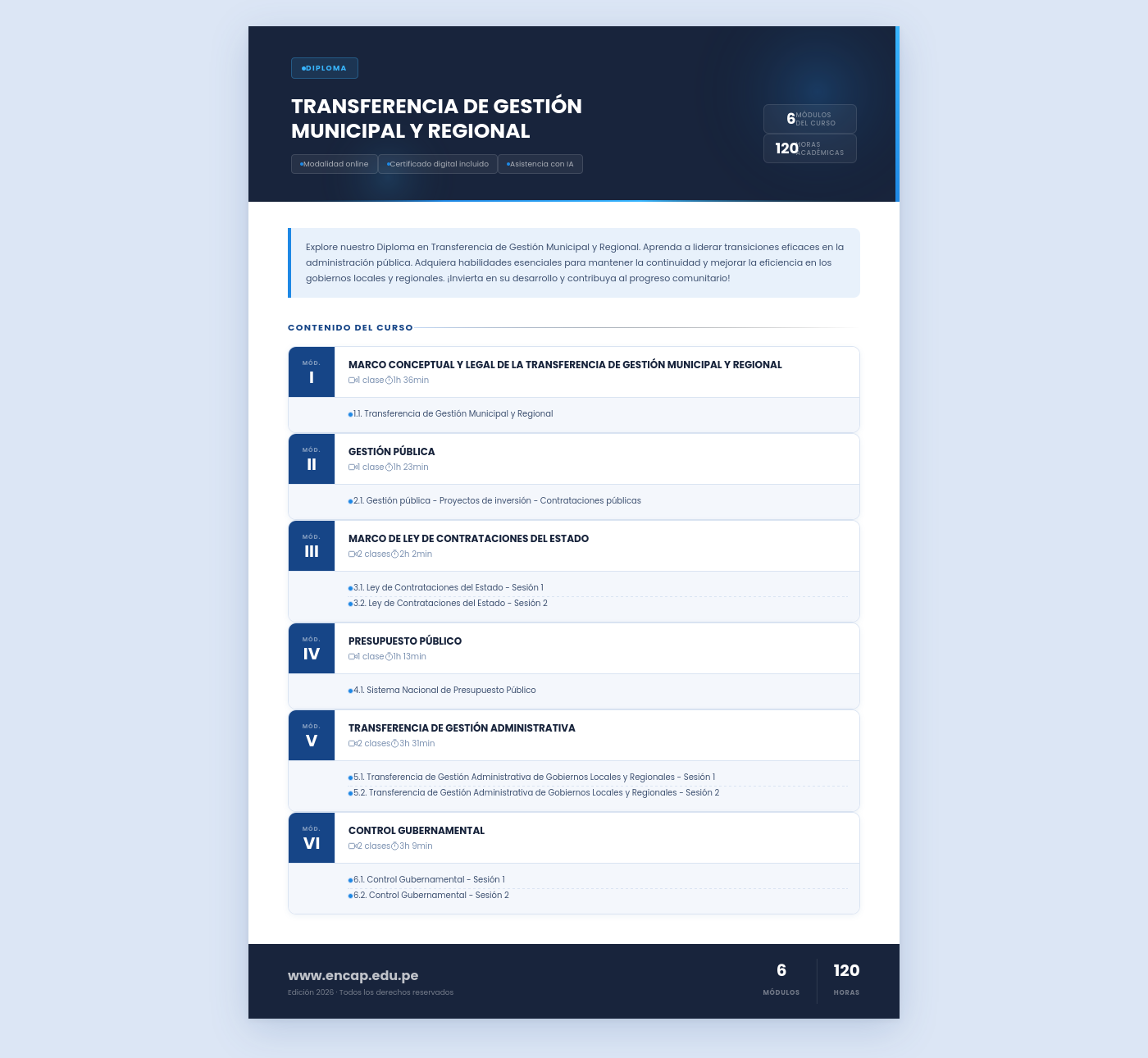 Explore nuestro Diploma en Transferencia de Gestión Municipal y Regional. Aprenda a liderar transiciones eficaces en la administración pública. Adquiera habilidades esenciales para mantener la continuidad y mejorar la eficiencia en los gobiernos locales y regionales. ¡Invierta en su desarrollo y contribuya al progreso comunitario!