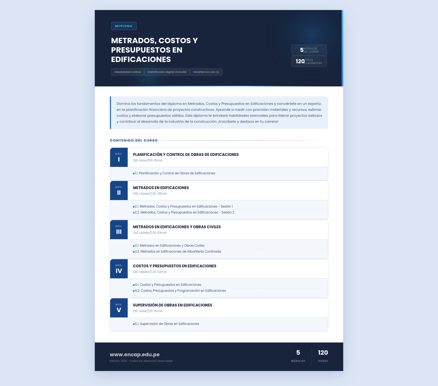 Domina los fundamentos del diploma en Metrados, Costos y Presupuestos en Edificaciones y conviértete en un experto en la planificación financiera de proyectos constructivos. Aprende a medir con precisión materiales y recursos, estimar costos y elaborar presupuestos sólidos. Este diploma te brindará habilidades esenciales para liderar proyectos exitosos y contribuir al desarrollo de la industria de la construcción. ¡Inscríbete y destaca en tu carrera!
