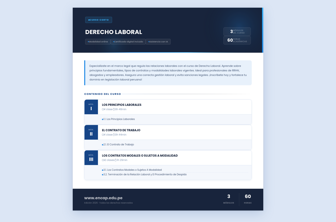Especialízate en el marco legal que regula las relaciones laborales con el curso de Derecho Laboral. Aprende sobre principios fundamentales, tipos de contratos y modalidades laborales vigentes. Ideal para profesionales de RRHH, abogados y empleadores. Asegura una correcta gestión laboral y evita sanciones legales. ¡Inscríbete hoy y fortalece tu dominio en legislación laboral peruana!