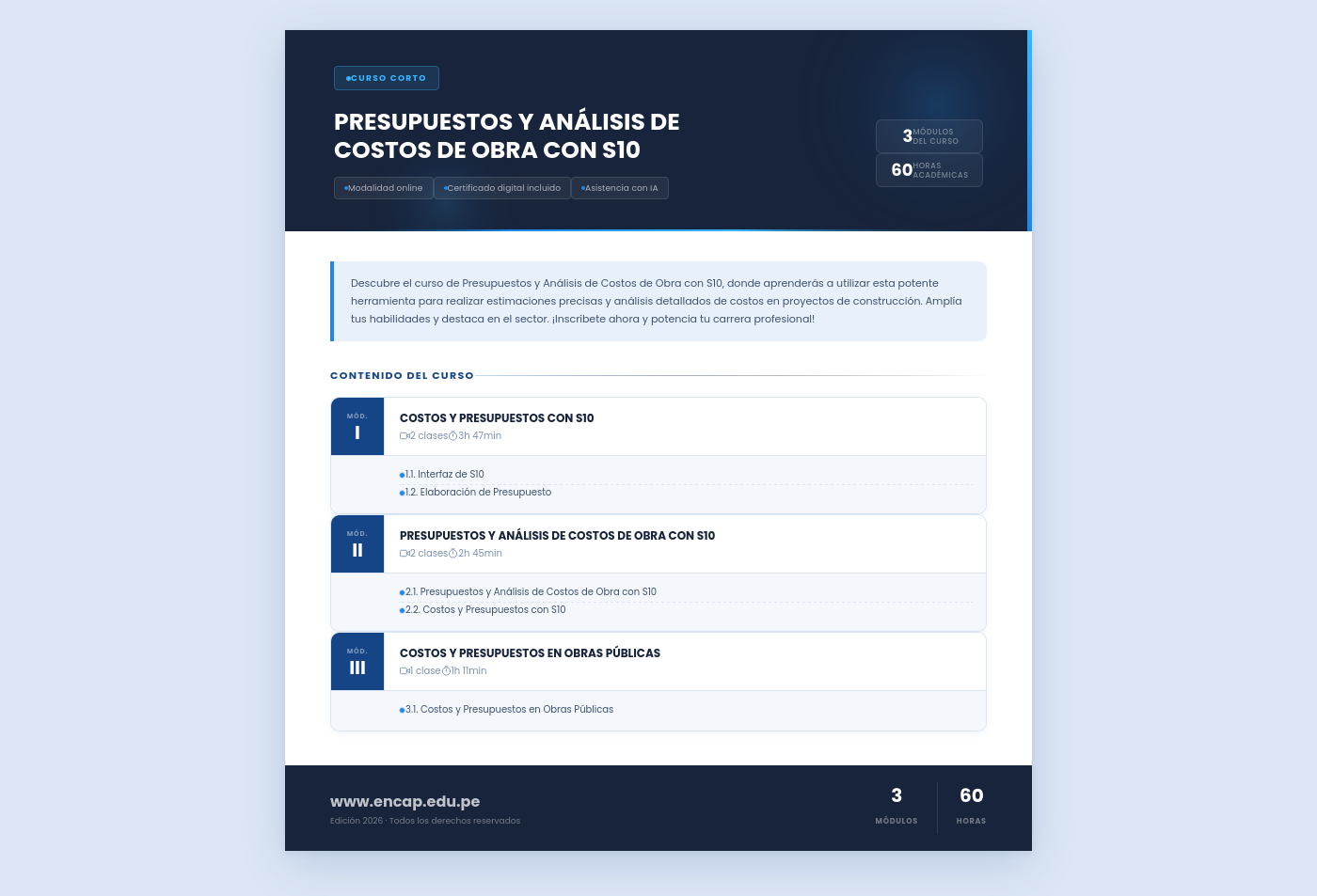 Descubre el curso de Presupuestos y Análisis de Costos de Obra con S10, donde aprenderás a utilizar esta potente herramienta para realizar estimaciones precisas y análisis detallados de costos en proyectos de construcción. Amplía tus habilidades y destaca en el sector. ¡Inscríbete ahora y potencia tu carrera profesional!