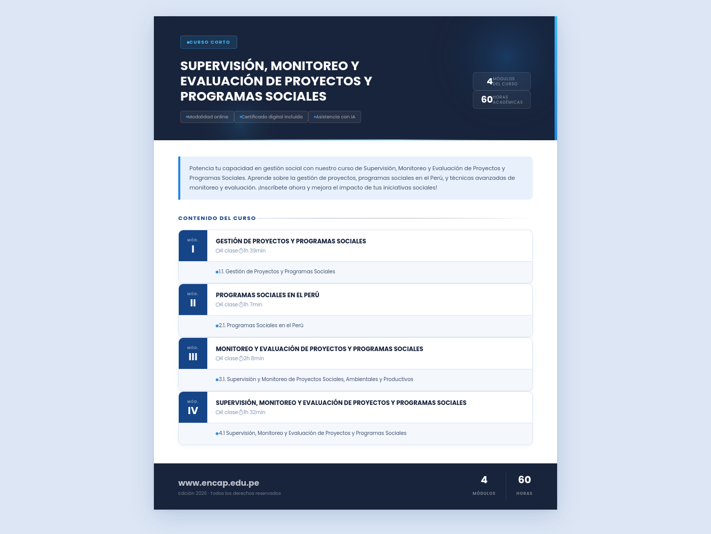 Potencia tu capacidad en gestión social con nuestro curso de Supervisión, Monitoreo y Evaluación de Proyectos y Programas Sociales. Aprende sobre la gestión de proyectos, programas sociales en el Perú, y técnicas avanzadas de monitoreo y evaluación. ¡Inscríbete ahora y mejora el impacto de tus iniciativas sociales!