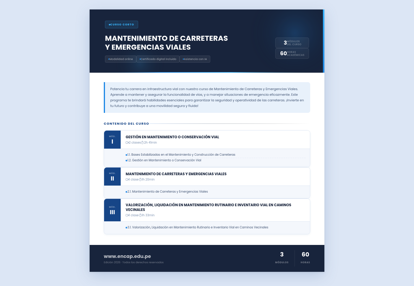 Potencia tu carrera en infraestructura vial con nuestro curso de Mantenimiento de Carreteras y Emergencias Viales. Aprende a mantener y asegurar la funcionalidad de vías, y a manejar situaciones de emergencia eficazmente. Este programa te brindará habilidades esenciales para garantizar la seguridad y operatividad de las carreteras. ¡Invierte en tu futuro y contribuye a una movilidad segura y fluida!