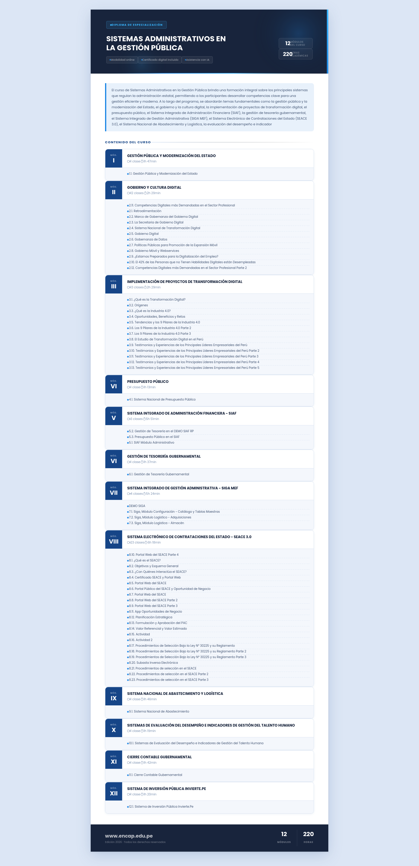 El curso de Sistemas Administrativos en la Gestión Pública brinda una formación integral sobre los principales sistemas que regulan la administración estatal, permitiendo a los participantes desarrollar competencias clave para una gestión eficiente y moderna. A lo largo del programa, se abordarán temas fundamentales como la gestión pública y la modernización del Estado, el gobierno y la cultura digital, la implementación de proyectos de transformación digital, el presupuesto público, el Sistema Integrado de Administración Financiera (SIAF), la gestión de tesorería gubernamental, el Sistema Integrado de Gestión Administrativa (SIGA MEF), el Sistema Electrónico de Contrataciones del Estado (SEACE 3.0), el Sistema Nacional de Abastecimiento y Logística, la evaluación del desempeño e indicador