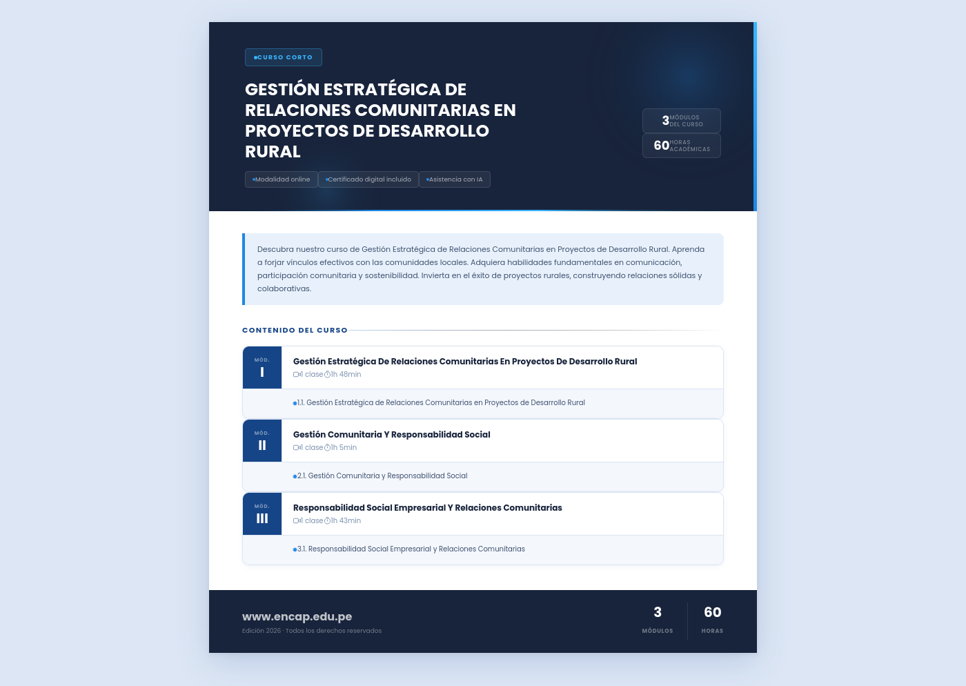 Descubra nuestro curso de Gestión Estratégica de Relaciones Comunitarias en Proyectos de Desarrollo Rural. Aprenda a forjar vínculos efectivos con las comunidades locales. Adquiera habilidades fundamentales en comunicación, participación comunitaria y sostenibilidad. Invierta en el éxito de proyectos rurales, construyendo relaciones sólidas y colaborativas.