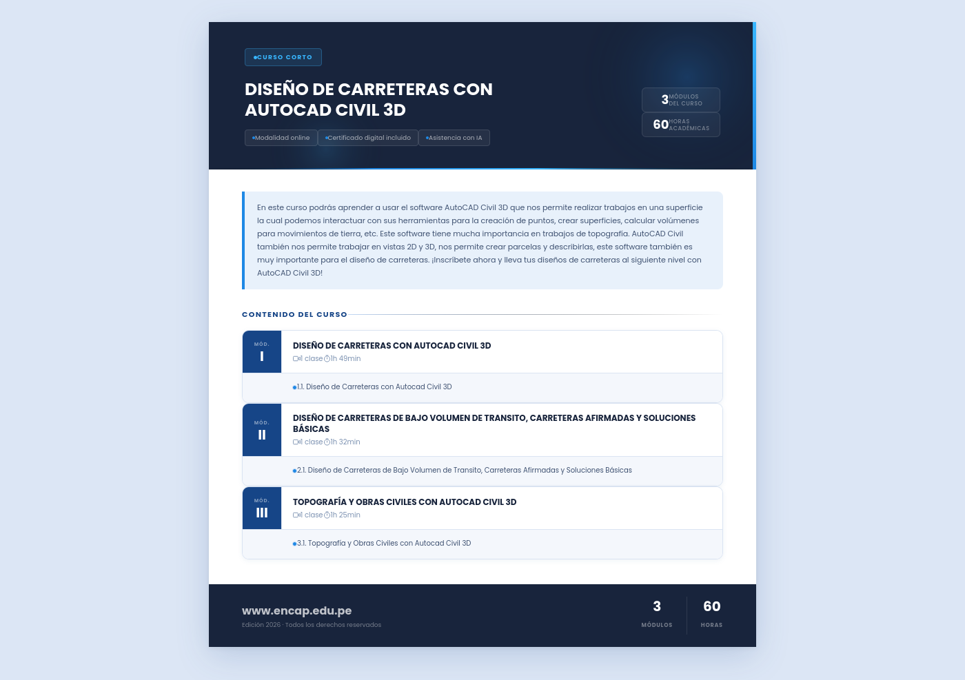 En este curso podrás aprender a usar el software AutoCAD Civil 3D que nos permite realizar trabajos en una superficie la cual podemos interactuar con sus herramientas para la creación de puntos, crear superficies, calcular volúmenes para movimientos de tierra, etc. Este software tiene mucha importancia en trabajos de topografía. AutoCAD Civil también nos permite trabajar en vistas 2D y 3D, nos permite crear parcelas y describirlas, este software también es muy importante para el diseño de carreteras. ¡Inscríbete ahora y lleva tus diseños de carreteras al siguiente nivel con AutoCAD Civil 3D!