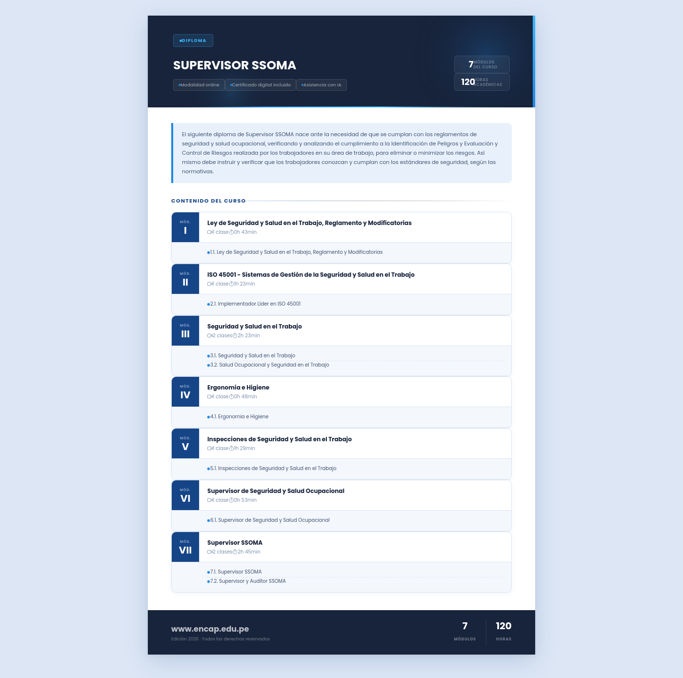 El siguiente diploma de Supervisor SSOMA nace ante la necesidad de que se cumplan con los reglamentos de seguridad y salud ocupacional, verificando y analizando el cumplimiento a la Identificación de Peligros y Evaluación y Control de Riesgos realizada por los trabajadores en su área de trabajo, para eliminar o minimizar los riesgos. Así mismo debe instruir y verificar que los trabajadores conozcan y cumplan con los estándares de seguridad, según las normativas.