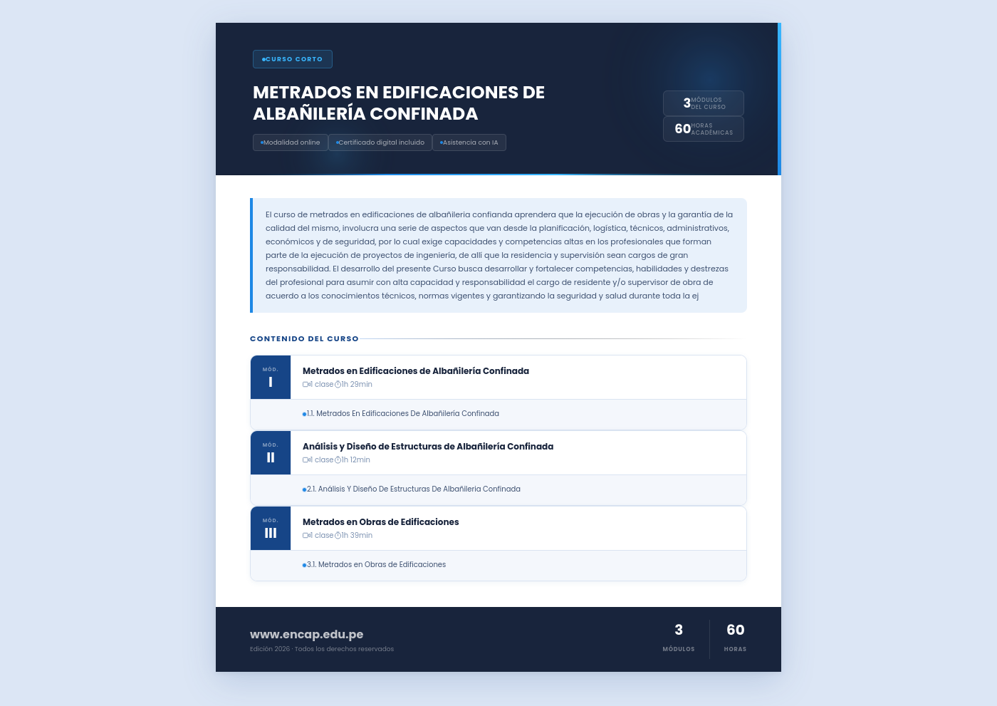 El curso de metrados en edificaciones de albañileria confianda aprendera que la ejecución de obras y la garantía de la calidad del mismo, involucra una serie de aspectos que van desde la planificación, logística, técnicos, administrativos, económicos y de seguridad, por lo cual exige capacidades y competencias altas en los profesionales que forman parte de la ejecución de proyectos de ingeniería, de allí que la residencia y supervisión sean cargos de gran responsabilidad. El desarrollo del presente Curso busca desarrollar y fortalecer competencias, habilidades y destrezas del profesional para asumir con alta capacidad y responsabilidad el cargo de residente y/o supervisor de obra de acuerdo a los conocimientos técnicos, normas vigentes y garantizando la seguridad y salud durante toda la ej