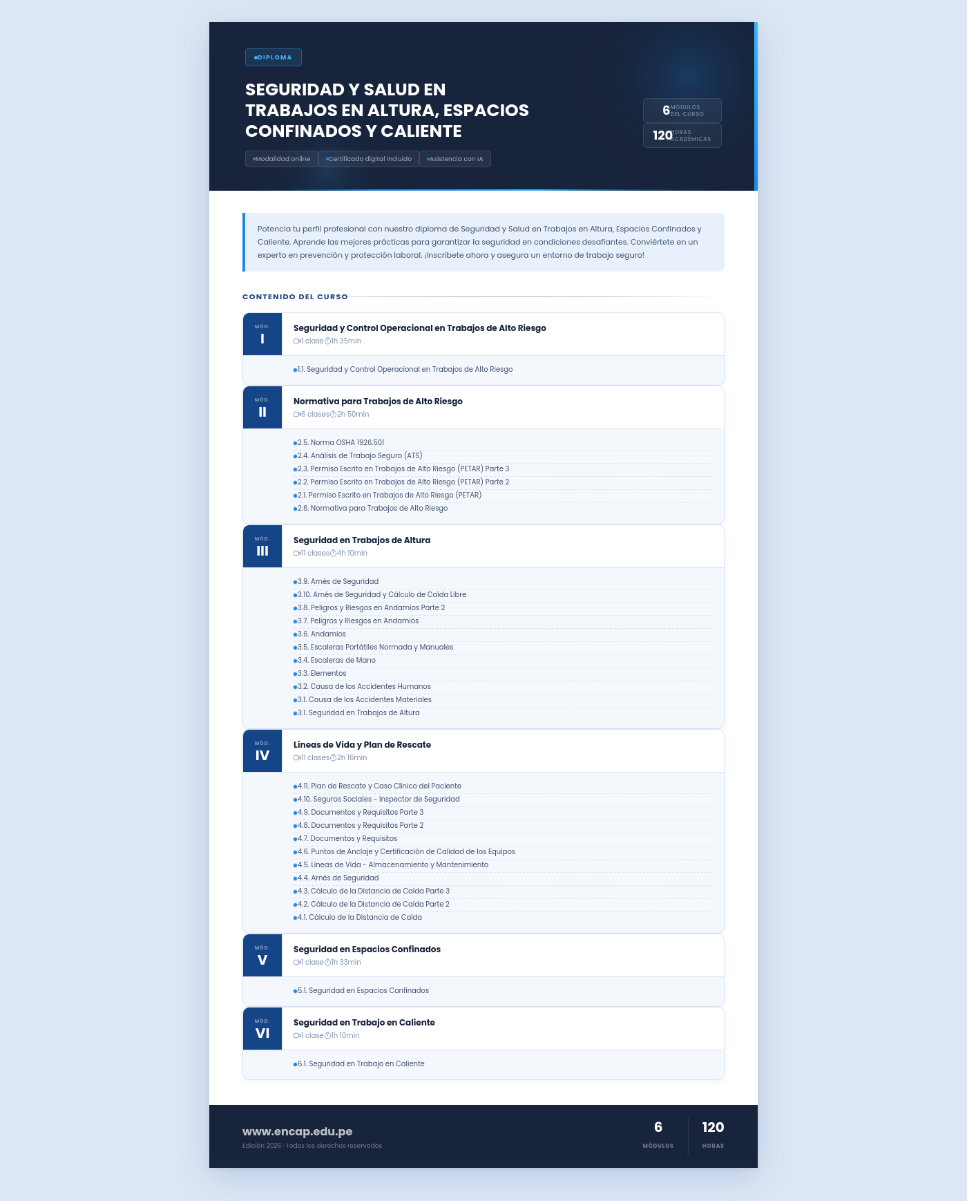 Potencia tu perfil profesional con nuestro diploma de Seguridad y Salud en Trabajos en Altura, Espacios Confinados y Caliente. Aprende las mejores prácticas para garantizar la seguridad en condiciones desafiantes. Conviértete en un experto en prevención y protección laboral. ¡Inscríbete ahora y asegura un entorno de trabajo seguro!