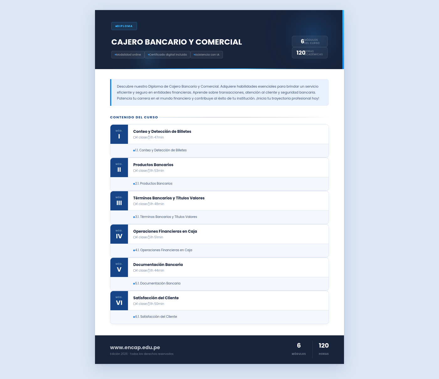Descubre nuestro Diploma de Cajero Bancario y Comercial. Adquiere habilidades esenciales para brindar un servicio eficiente y seguro en entidades financieras. Aprende sobre transacciones, atención al cliente y seguridad bancaria. Potencia tu carrera en el mundo financiero y contribuye al éxito de tu institución. ¡Inicia tu trayectoria profesional hoy!