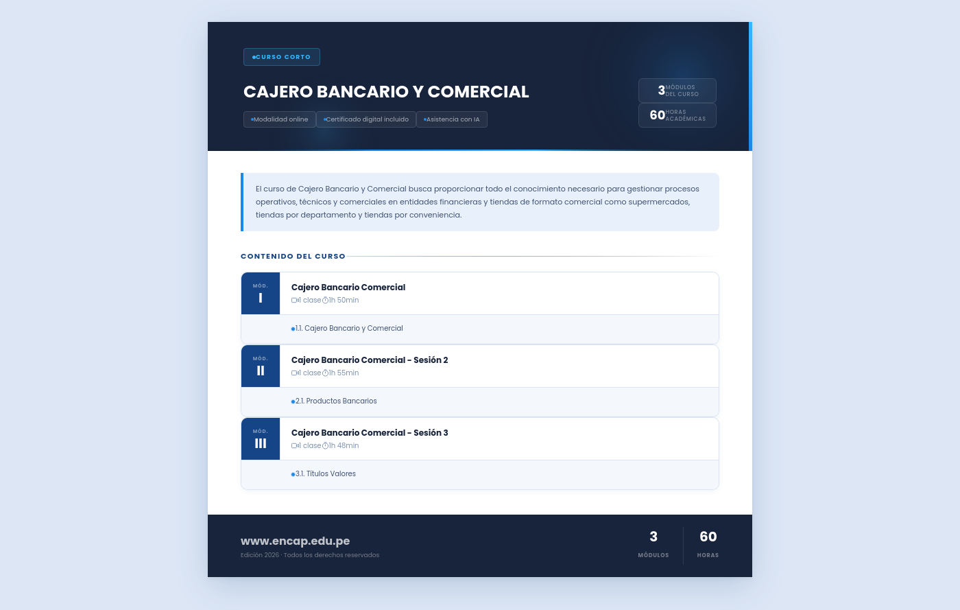 El curso de Cajero Bancario y Comercial busca proporcionar todo el conocimiento necesario para gestionar procesos operativos, técnicos y comerciales en entidades financieras y tiendas de formato comercial como supermercados, tiendas por departamento y tiendas por conveniencia.