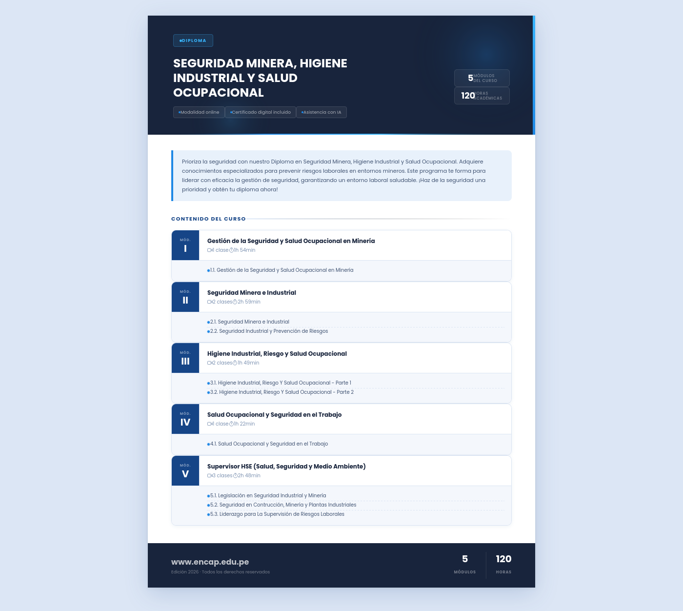 Prioriza la seguridad con nuestro Diploma en Seguridad Minera, Higiene Industrial y Salud Ocupacional. Adquiere conocimientos especializados para prevenir riesgos laborales en entornos mineros. Este programa te forma para liderar con eficacia la gestión de seguridad, garantizando un entorno laboral saludable. ¡Haz de la seguridad una prioridad y obtén tu diploma ahora!
