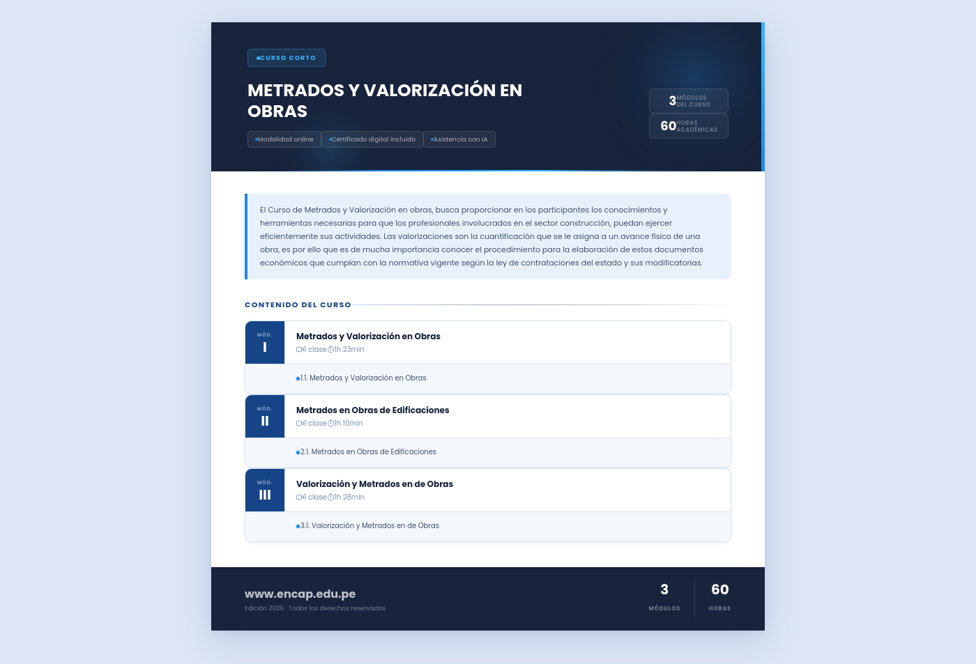 El Curso de Metrados y Valorización en obras, busca proporcionar en los participantes los conocimientos y herramientas necesarias para que los profesionales involucrados en el sector construcción, puedan ejercer eficientemente sus actividades. Las valorizaciones son la cuantificación que se le asigna a un avance físico de una obra, es por ello que es de mucha importancia conocer el procedimiento para la elaboración de estos documentos económicos que cumplan con la normativa vigente según la ley de contrataciones del estado y sus modificatorias.
