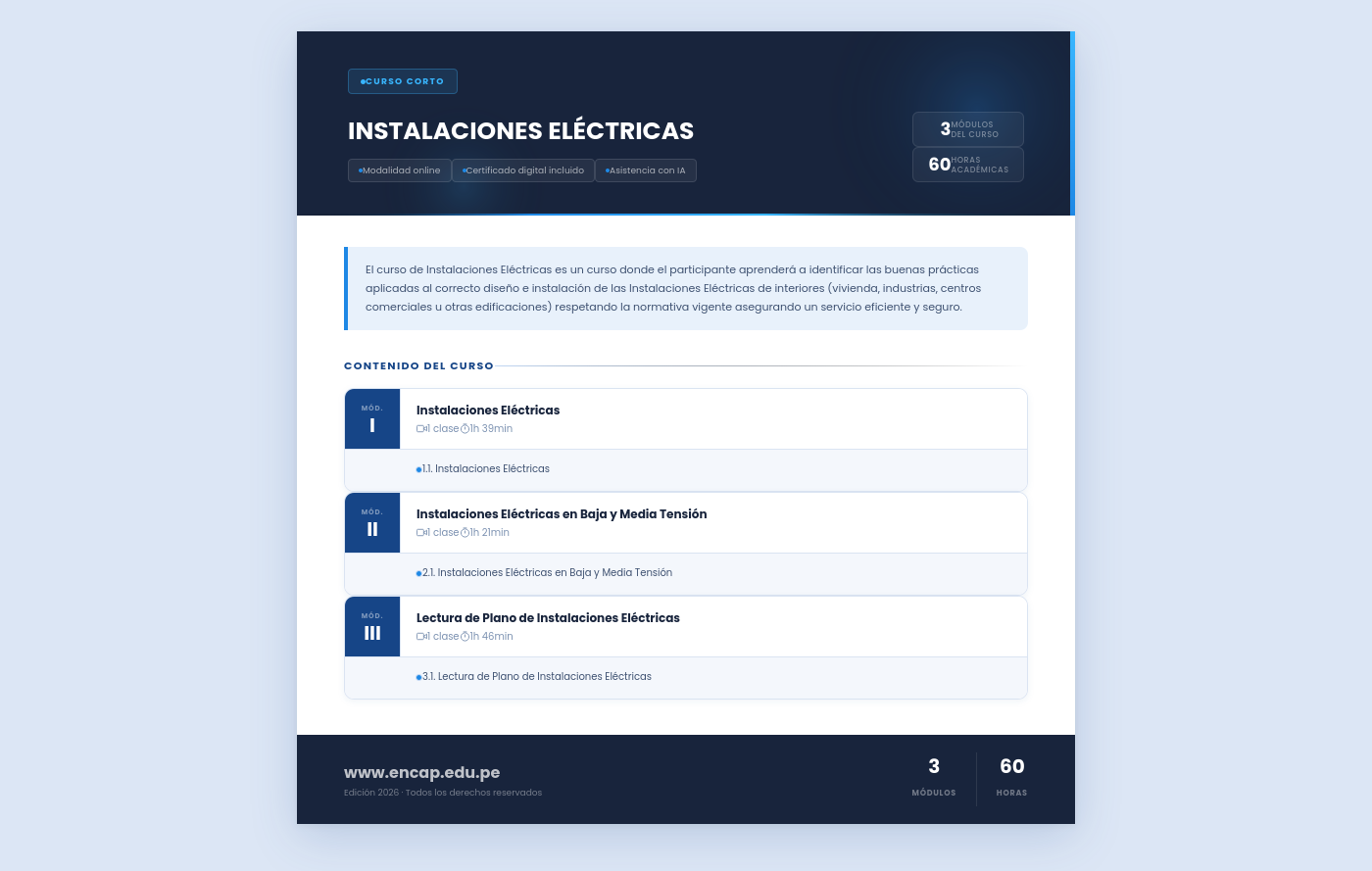 El curso de Instalaciones Eléctricas es un curso donde el participante aprenderá a identificar las buenas prácticas aplicadas al correcto diseño e instalación de las Instalaciones Eléctricas de interiores (vivienda, industrias, centros comerciales u otras edificaciones) respetando la normativa vigente asegurando un servicio eficiente y seguro.