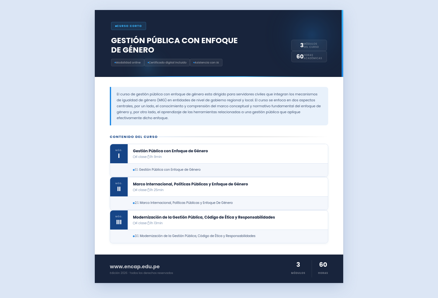 El curso de gestión pública con enfoque de género esta dirigido para servidores civiles que integran los mecanismos de igualdad de género (MIG) en entidades de nivel de gobierno regional y local. El curso se enfoca en dos aspectos centrales, por un lado, el conocimiento y comprensión del marco conceptual y normativo fundamental del enfoque de género y, por otro lado, el aprendizaje de las herramientas relacionadas a una gestión pública que aplique efectivamente dicho enfoque.