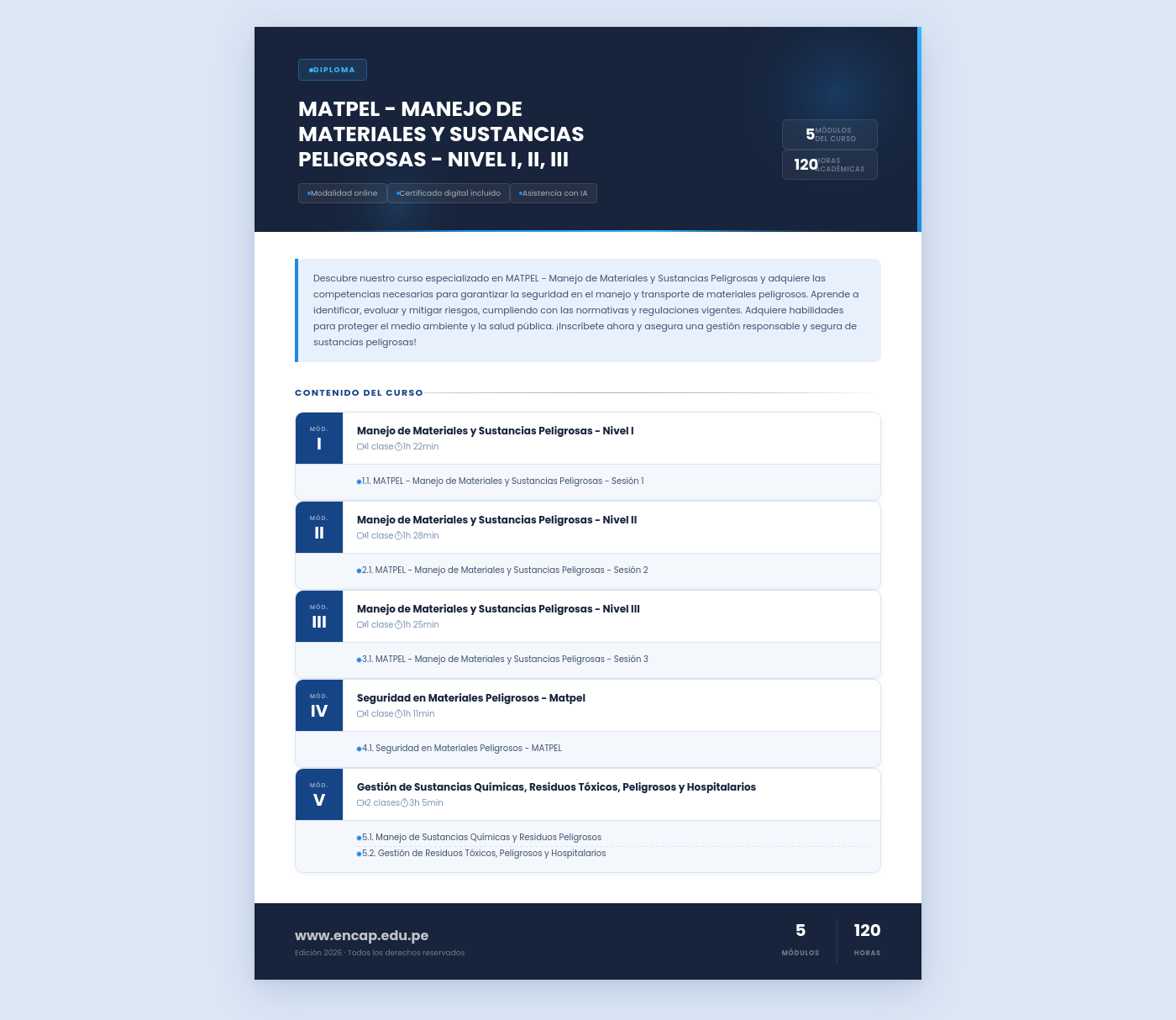 Descubre nuestro curso especializado en MATPEL - Manejo de Materiales y Sustancias Peligrosas y adquiere las competencias necesarias para garantizar la seguridad en el manejo y transporte de materiales peligrosos. Aprende a identificar, evaluar y mitigar riesgos, cumpliendo con las normativas y regulaciones vigentes. Adquiere habilidades para proteger el medio ambiente y la salud pública. ¡Inscríbete ahora y asegura una gestión responsable y segura de sustancias peligrosas!
